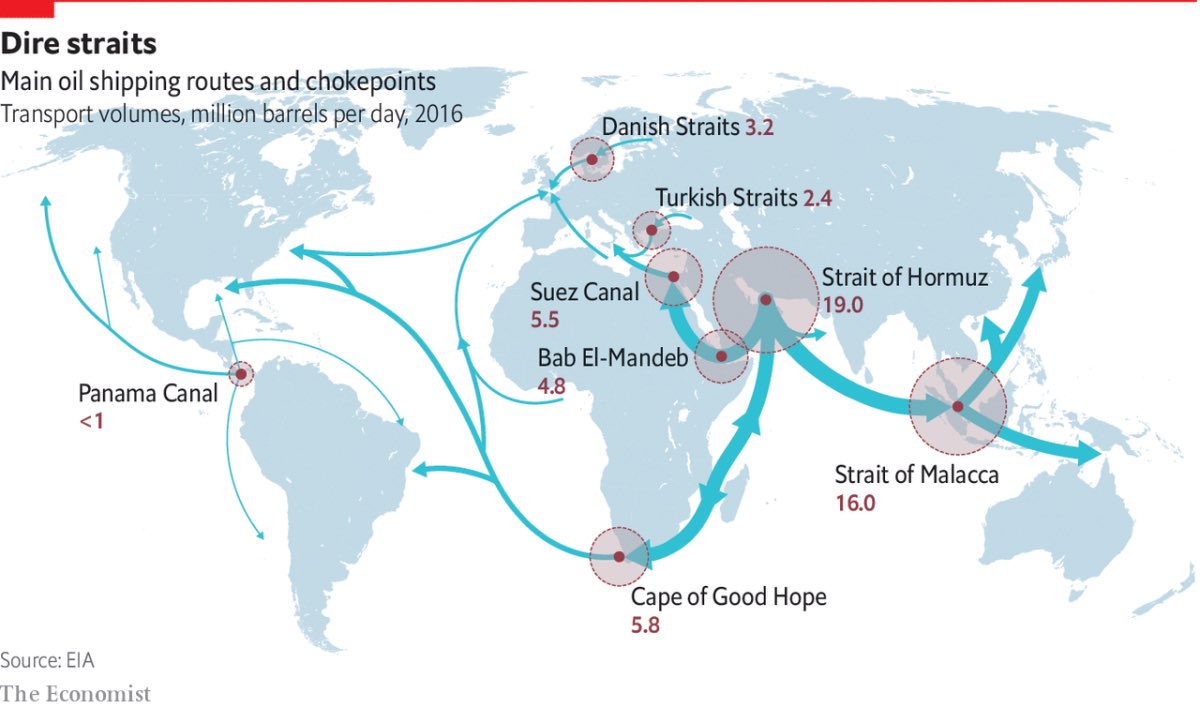 بەرزبوونەوەی نرخی وزە و پچڕانی زنجیرەكانی دابینكردنی جیهانی، ئەم سێ ڕێرەوە ئاوییە بەنزیكەیی دەكەونە یەك ناوچەی جوگرافی، لە ڕۆژهەڵاتی دەریای ناوەڕاستەوە تا كەنداوی فارس و زەریای هیند درێژدەبنەوە، ئەمەش وایكردووە ڕۆژهەڵاتی ناوەڕاست ببێتە یەكێك لە گرنگترین ناوەندە جیۆسیاسیەكانی جیهان.