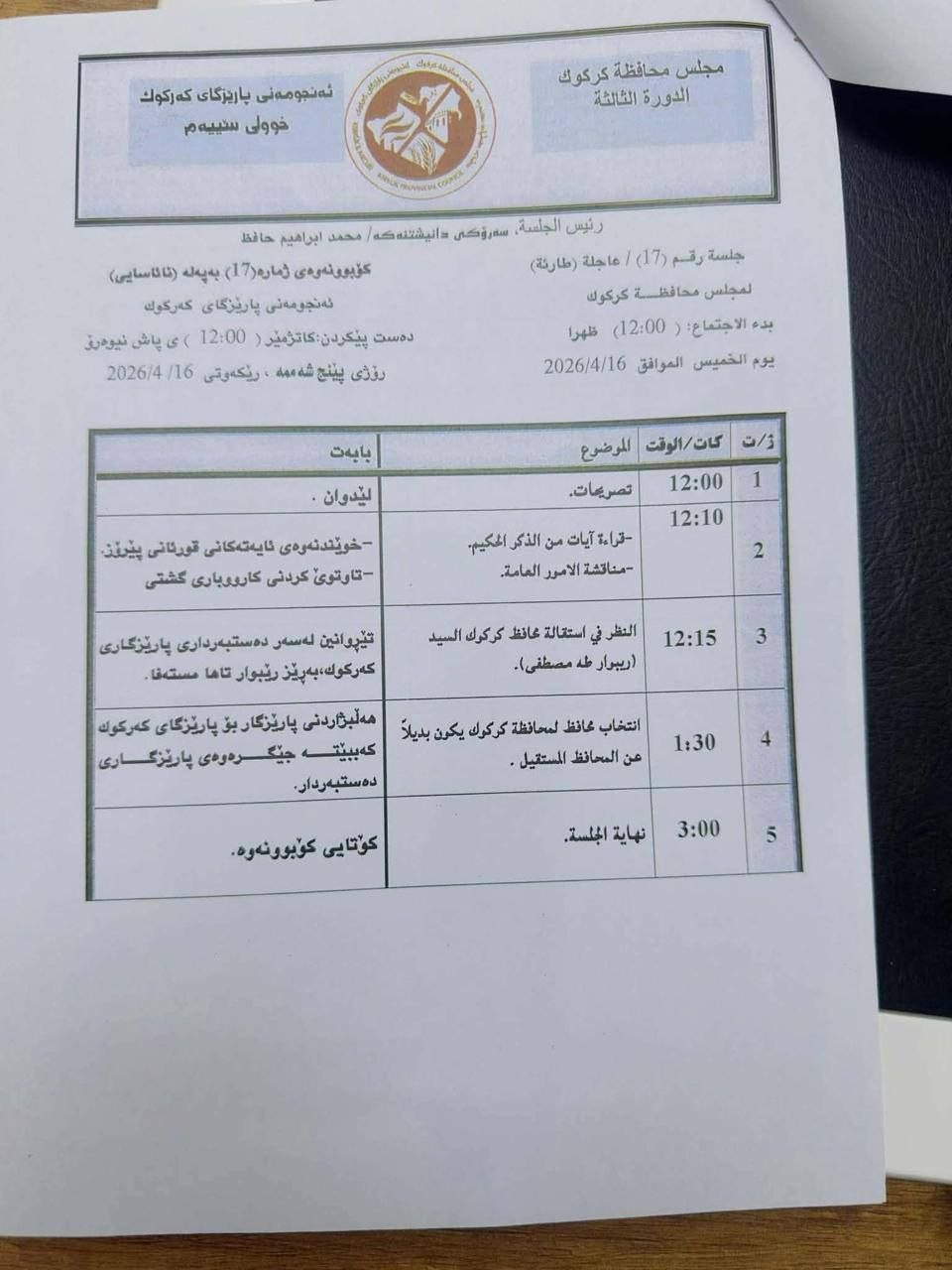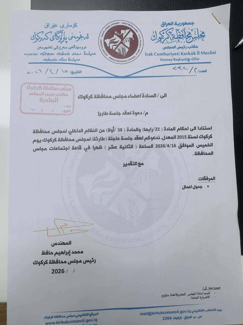 لە نووسراوەكەی محەمەد ئیبراهیم حافز، سەرۆكی ئەنجوومەنی پارێزگای كەركووك هاتووە: پاڵپشت بە مادەی 11/چوارەم و مادەی 38/ یەكەم لە پەیڕەوی ناوخۆی ئەنجوومەنی پارێزگای كەركوك ساڵی 2015ی هەمواركراو، داواتان لێدەكەم بۆ كۆبوونەوەیەكی بەپەلە كاتژمێر 12:00ی نیوەڕۆ رۆژی پێنجشەممە 16ی نیسانی 2026 لە هۆڵی كۆبوونەوەكانی ئەنجوومەن بن.
